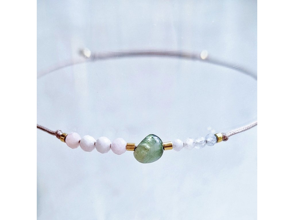 Fazetované minerály krásně zachytávají světlo a dodávají náramku éterickou jiskru. Pozlacené nerezové korálky jemně propojují barvy a dotvářejí harmonický vzhled.