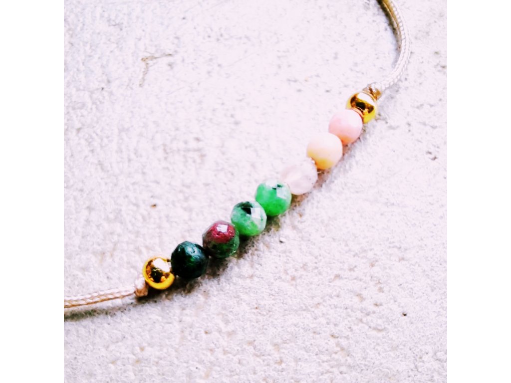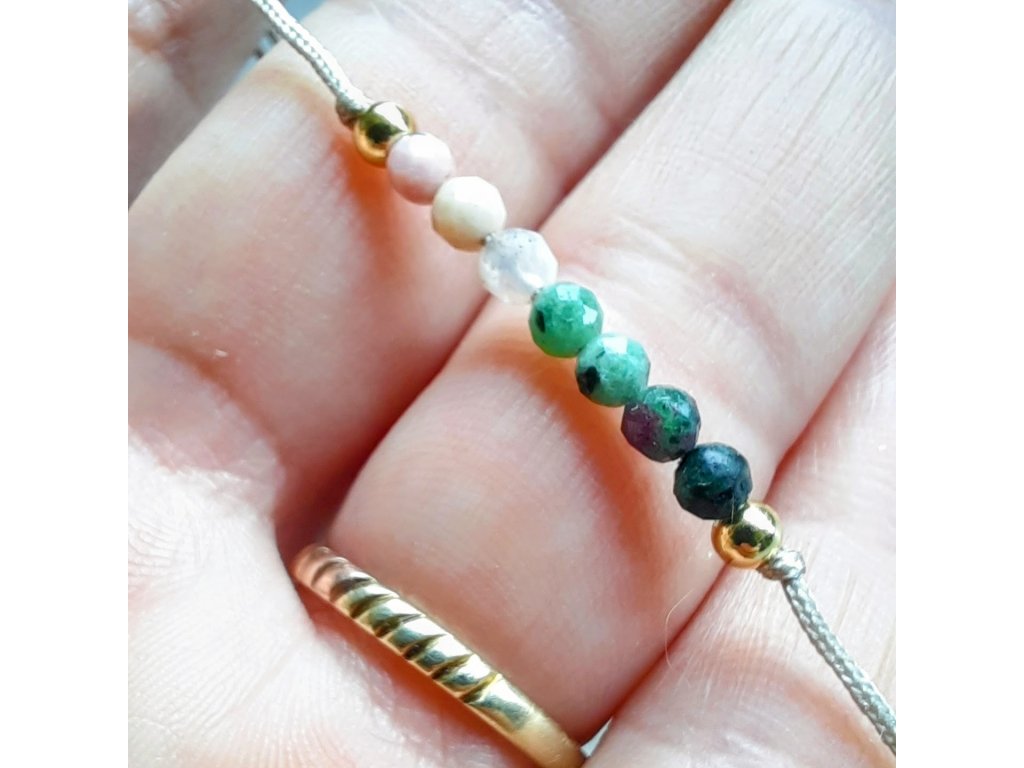 Sedm broušených kamenů a dva pozlacené korálky z nerez oceli na nylonové šňůrce.